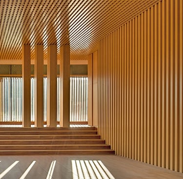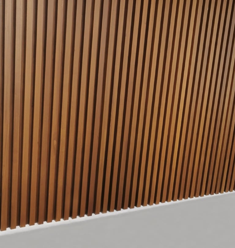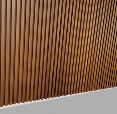 Os revestimentos de fachadas, paredes e sistemas de sombreamento ripado são produzidos com uma base de alumínio, folheado a madeira natural ou lacado com acabamento a imitar madeira, combinando estética e durabilidade.